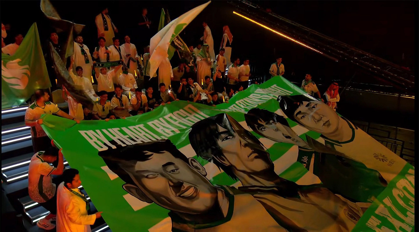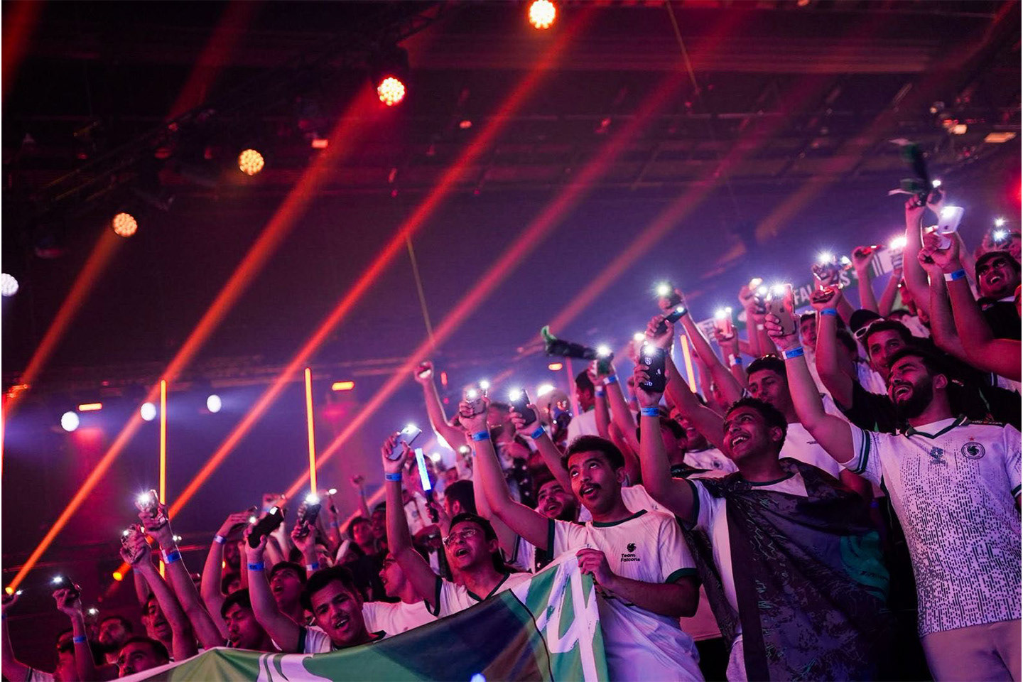 The color palette draws from Saudi green, desert tones, and vibrant energy lighting, designed to stand out both digitally and in the stadium environment.